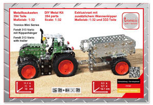 TRONICO Mini Series - FENDT 313 VARIO Traktor mit Kippanhänger, Maßstab 1:32, 751 Teile, Maße: ca. 29,5 x 11 x 11 cm. mit Freilauf, Profilreifen aus weichem Kunststoff, alle Teile farblich bedruckt, mit Anhängerkupplung, Anhänger mit Kippfunktion, Gewicht des Sets ist 0,75 Kg. Altersempfehlung ab 8 Jahren.