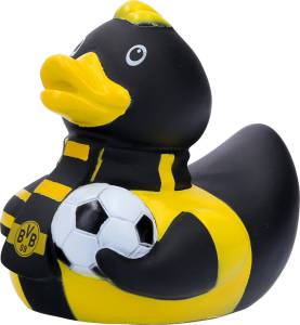 Schwarze Borussia Dortmund BVB 9 Badeente "Schal". Material: 100% Polyvinylchlorid. Maße: ca. 8 x 9 x 10 cm. In dekorativer Fenster-Geschenkbox. BVB Badeentchen im gelben Trikot mit BVB 09 Fan-Schal mit Logo und Fußball.