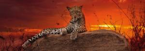 So schön! So gefährlich! Vor einem blutroten Abendhimmel lauert majestätisch der herrliche Leopard auf einem Stein mit bester Aussicht. Oder ruht er nur aus?