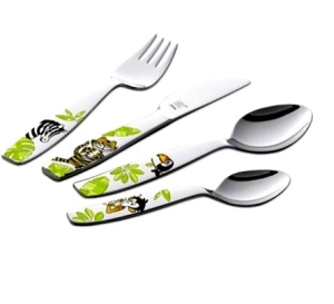Kinderbesteck Jungle 4-teilig. Material: Edelstahl. Maße: ca. 17 cm (Messer), 15,5 cm (Gabel), 15,5 cm (großer Löffel), 12,5 cm (kleiner Löffel). Farbe: silberfarben. Spülmaschinenfest.