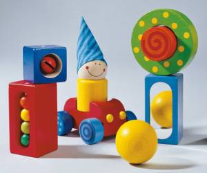 Haba Erste Steine. Material: Holz. Sechs verschiedene Bausteine und ein kleines Auto mit Fahrer zum Spielen, Bauen, Zuordnen und Entdecken, denn jeder von ihnen hat einen besonderen Reiz - akustisch oder optisch. Altersempfehlung: ab 12 Monaten.