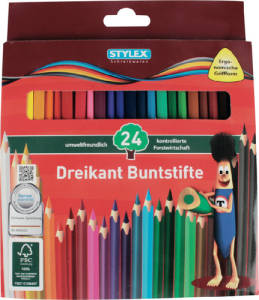 Dreikantbuntstifte. Material: FSC - Holz, lackiert. 24 Stück. In Faltschachtel.