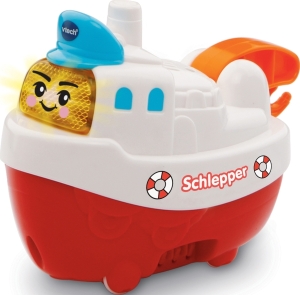 Vtech Tut Tut Baby Badewelt - Schlepper. Material: Kunststoff. Maße: ca. 10 x 10,6 x 8 cm. Ich bin ein starker Schlepper! Spricht themenbezogene Sätze, singt und macht lustige Geräusche. Leuchtende Taste zum Drücken. Durch Bewegung der Räder werden Melodien und Geräusche ausgelöst. 4 gesungene Lieder, 10 Kindermelodien. Kindersicheres Batteriefach und Abschaltautomatik. Demobatterie 1 x AAA enthalten. Ab 12 Monaten.