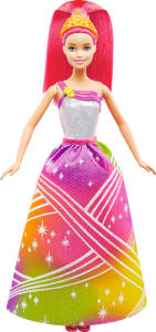 Diese zauberhafte Barbie-Prinzessin erwacht mit Lichtern und Geräuschen zum Leben! Ein Druck auf den Regenbogen-Edelstein an ihrem Kunststoffoberteil genügt, um in ihr Regenbogen Königreich zu gelangen und sieben verschiedene Lichterfolgen und passende Geräusche zu aktivieren. Wow! Diesen magischen Moment wird das Mädchen immer wieder erleben wollen: Barbies Kleid und ihr langer, leuchtend orangefarbener Pferdeschwanz erstrahlen in einer wunderschönen Regenbogen-Lichtershow, für die das transparente Oberteil mit den bunten Details an Ausschnitt und Träger den perfekten Hintergrund bietet. Der lange, in Regenbogenfarben schimmernde und von funkelnden Streifen und Sternen gezierte Rock lässt alles noch spektakulärer wirken. Komplettiert wird das königliche Outfit von pinkfarbenen Schuhen. Mit ihrer fantastischen Lichtershow wird diese Puppe Magie in jede Geschichte bringen, Zuschauer verzaubern und die Welt des Mädchens in Regenbogenfarben tauchen. Barbie-Prinzessinnenpuppe mit Lichtershow- und Geräuschfunktion, abnehmbarem Rock, Schuhen und Diadem enthalten.