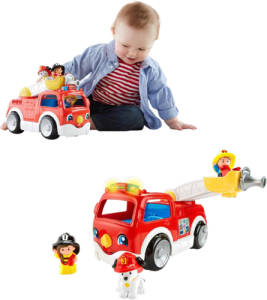 Fisher Price Feuerwehrauto mit Feuerwehrmann, Feuerwhrfrau und Dalmatiner. Figuren können die Leiter auf und ab steigen.