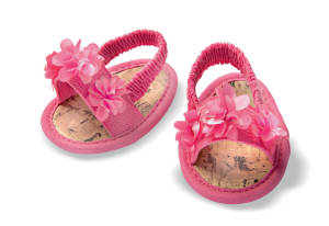 Sommerliche Sandalen mit raffinierten Blütenapplikationen. Für Puppen von 38-45 cm.