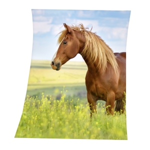 Pferde Fleecedecke "Frühling". Material: 100% Polyester. Maße: ca. 130 x 160 cm. Waschbar. Mit einem Pferd auf einer wunderschönen gelben Wiese mit blauem Himmel als Motiv.